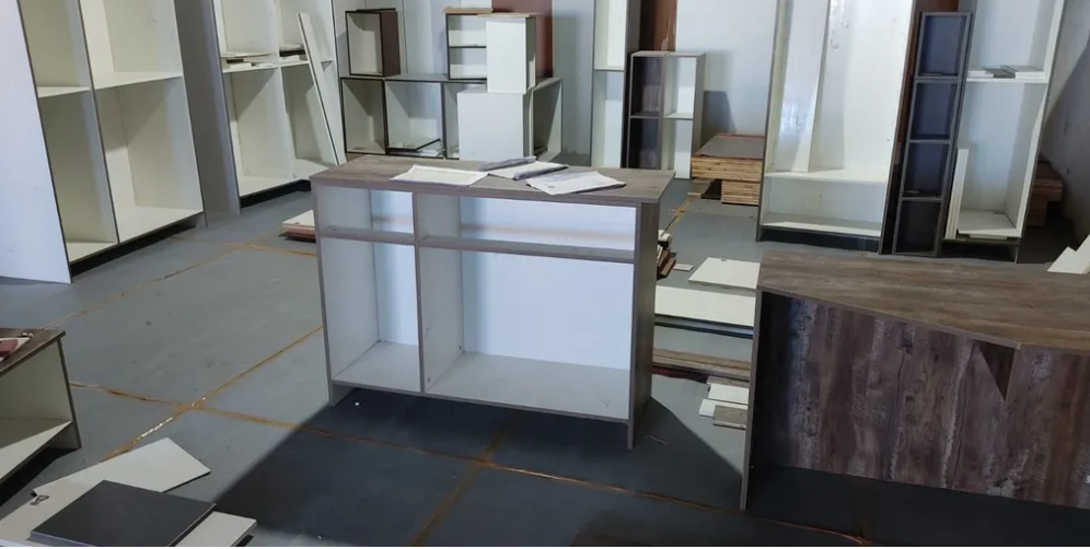 First all the laminates are pasted on the full plywood (unlike carpenters make the wardrobe first and then cat & paste the laminates).